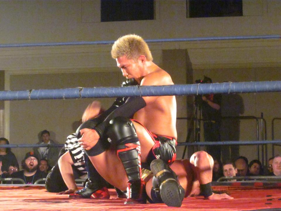 3 – Junction III member Masato Yoshino made Blood Warriors member Naruki Doi tapout to his “Sol Naciente Kai” submission hold, which looks like a modified triangle submission hold w/ a double-cross armbar. Great match, w/ a great showing of the two’s puroresu style.