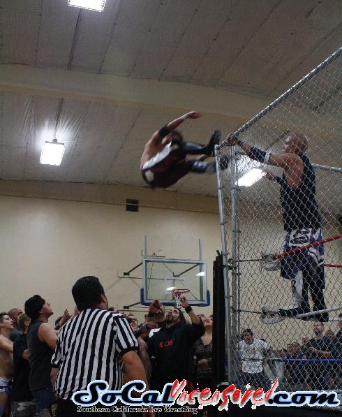 and Vega headed to the back where the entire locker room had already emptied to see the show close out. None of the wrestlers intervened, so B-Boy and SoCal Crazy would chase the opposition, they had the New Wave Rapid Division and New Wave Heavyweight Championship, and you can’t let them leave with those titles. As the heroes ran to the back to bring the trio back to a cage, a street fight broke out. The return to the cage was put on hold when the duo battled in the crowd in the Clairemount Boys and Girls Club. The action nearly spilled into the streets and forced fans out of their seats, for some to watch and for some for safety. As the match started to show some semblance of returning to the cage, B-Boy brought some good old fashion Dusty Rhodes approved pummeling, complete with a giant crayon, cookie tins, chairs, tables, and thumbtacks. Business was certainly picking up. The match was billed as a “4 Way NO HOLDS BARRED STEEL CAGE MATCH.” I think the fans in San Diego were more than a little surprised that cooking tins, giant crayons, chairs, tables and even thumbtacks would play a part in this match. Wasn’t the cage enough B-Boy? “See, you would think it would be enough and I take complete blame for that, because quite honestly all the gimmicks in the match were my idea. My thoughts going into the match is that the feud was going on for over a year and it needed just a bit more then just a cage… a cage match that no one has seen live or has never been done in New Wave. I brought up the idea to the guys and everyone agreed that it had to happen. Granted some might think it might have been overboard…. but honestly fuck ‘em. ‘Cause bottom line is it was New Waves last show, we were the headliners and we had to bring everything we had to give New Wave a proper send off even if it included us being hurt after. Sometimes in wrestling, you have to give more then you want… or more importantly give more then what people expect. It’s the nature of being a performer especially with a company that was good to you. I will tell you that all the holes in my body, the bruises… the lumps on my head… the cuts and the physical aftermath was worth it and I would do it all over again if I needed too. “