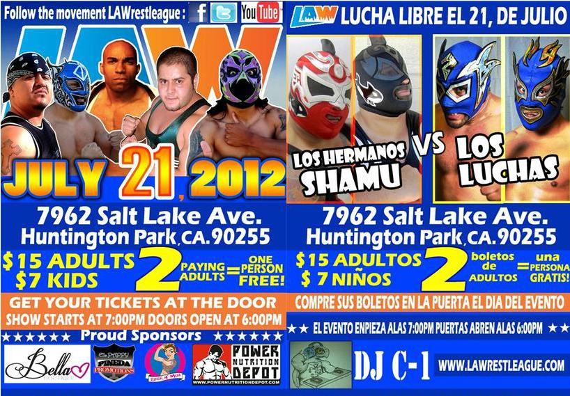 Los Angeles Wrestleague Jul 21st Posted By: Jay Cal 07/16/2012 Los Angeles Wrestleague Saturday July 21st 2012 • 7:00PM El Pappy’s Gym 7962 Salt Lake Ave., Huntington Park Tickets: $15, $7 for Kids, (Buy 2 Adults, Get 1 Free) Share this: Click to email a link to a friend (Opens in new window) Email Click to share on Facebook (Opens in new window) Facebook Click to share on X (Opens in new window) X Click to share on Reddit (Opens in new window) Reddit Click to share on Tumblr (Opens in new window) Tumblr Click to share on Threads (Opens in new window) Threads Click to share on Bluesky (Opens in new window) Bluesky Click to share on Pinterest (Opens in new window) Pinterest