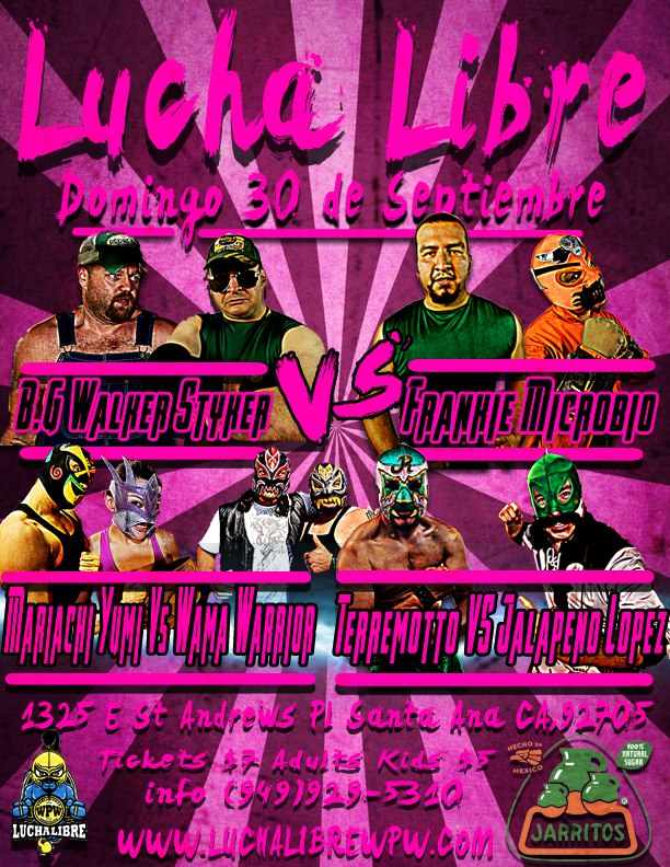 WPW Sept. 30th Posted By: Jay Cal 09/27/2012 WPW Lucha Libre Sunday September 30th 2012 • 5:30PM 1325 E. St. Andrews Pl., Santa Ana Tickets: $7, $5 for Kids Main Event Big Walker & Stryker vs. Frankie & Microbio Mariachi & Yumi vs. Wama & Warrior Terremotto vs. Jalapeno Lopez Share this: Click to email a link to a friend (Opens in new window) Email Click to share on Facebook (Opens in new window) Facebook Click to share on X (Opens in new window) X Click to share on Reddit (Opens in new window) Reddit Click to share on Tumblr (Opens in new window) Tumblr Click to share on Threads (Opens in new window) Threads Click to share on Bluesky (Opens in new window) Bluesky Click to share on Pinterest (Opens in new window) Pinterest