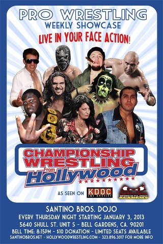 Firstly, we have a new live weekly show starting Thursday January 3, 2013, in association with Championship Wrestling from Hollywood. Every Thursday nite you can see up close and personal such superstars as TV Title Champion Willie Mack, the VooDoo King Kaos, Ray Rosas, The Bandidos Rico Dynamite & Tito Escondido w/ Jezabel, Peter Avalon, Che Cabrera and many more! Check out this hot, hard hitting, in your face action every week! Plus check them out on KDOC-TV every Saturday nite at 1am.