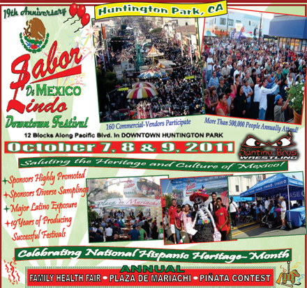 12 blocks along Pacific Blvd in Downtown Huntington Park. October 7, 8, & 9, 2011saluting the Heritage & Culture of Mexico. Along with the Sunday’s wrestling show, there will be a Family Health Center, Plaza de Mariachi, Menudo Cooking contest and children’s handmade Pinata contest, all free to the public thruout the 3 days of festivities!!! Come support your local community.