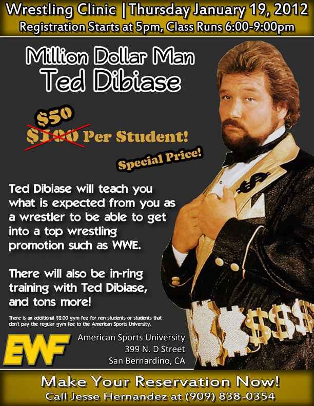 The Million Dollar Man with the EWF will teach students what WWE is looking for, there will also be some in-ring training. Make your reservations by calling Jesse at (909) 838-0354. The seminar will take place at the American Sports University 399 N. D Street, San Bernardino.