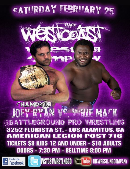 WestCoast Championship Match Schedule for Feb. 25th Posted By: Jay Cal 02/03/2012 Just added to Battleground Pro Wrestling on February 25th in Los Alamitos, CA: Joey Ryan vs. Willie Mack for the The West Coast Wrestling Company Championship. Share this: Click to email a link to a friend (Opens in new window) Email Click to share on Facebook (Opens in new window) Facebook Click to share on X (Opens in new window) X Click to share on Reddit (Opens in new window) Reddit Click to share on Tumblr (Opens in new window) Tumblr Click to share on Threads (Opens in new window) Threads Click to share on Bluesky (Opens in new window) Bluesky Click to share on Pinterest (Opens in new window) Pinterest