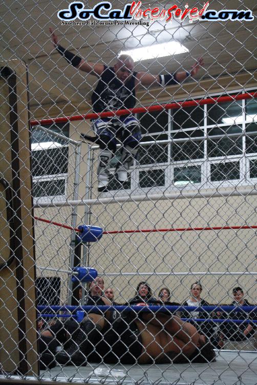 and Vega headed to the back where the entire locker room had already emptied to see the show close out. None of the wrestlers intervened, so B-Boy and SoCal Crazy would chase the opposition, they had the New Wave Rapid Division and New Wave Heavyweight Championship, and you can’t let them leave with those titles. As the heroes ran to the back to bring the trio back to a cage, a street fight broke out. The return to the cage was put on hold when the duo battled in the crowd in the Clairemount Boys and Girls Club. The action nearly spilled into the streets and forced fans out of their seats, for some to watch and for some for safety. As the match started to show some semblance of returning to the cage, B-Boy brought some good old fashion Dusty Rhodes approved pummeling, complete with a giant crayon, cookie tins, chairs, tables, and thumbtacks. Business was certainly picking up. The match was billed as a “4 Way NO HOLDS BARRED STEEL CAGE MATCH.” I think the fans in San Diego were more than a little surprised that cooking tins, giant crayons, chairs, tables and even thumbtacks would play a part in this match. Wasn’t the cage enough B-Boy? “See, you would think it would be enough and I take complete blame for that, because quite honestly all the gimmicks in the match were my idea. My thoughts going into the match is that the feud was going on for over a year and it needed just a bit more then just a cage… a cage match that no one has seen live or has never been done in New Wave. I brought up the idea to the guys and everyone agreed that it had to happen. Granted some might think it might have been overboard…. but honestly fuck ‘em. ‘Cause bottom line is it was New Waves last show, we were the headliners and we had to bring everything we had to give New Wave a proper send off even if it included us being hurt after. Sometimes in wrestling, you have to give more then you want… or more importantly give more then what people expect. It’s the nature of being a performer especially with a company that was good to you. I will tell you that all the holes in my body, the bruises… the lumps on my head… the cuts and the physical aftermath was worth it and I would do it all over again if I needed too. “