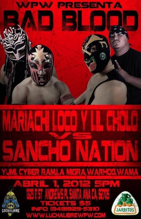 WPW Presents Bad Blood Apr. 1st Posted By: Jay Cal 03/30/2012 WPW Presents Bad Blood Sunday April 1st 2012 • 5:00PM 1325 E. St. Andrews Place, Santa Ana Tickets: $5 Main Event Mariachi Loco & Lil Cholo vs. Sancho Nation. Also Yumi, Cyber Ram, La Migra, Warhog, WAMA Share this: Click to email a link to a friend (Opens in new window) Email Click to share on Facebook (Opens in new window) Facebook Click to share on X (Opens in new window) X Click to share on Reddit (Opens in new window) Reddit Click to share on Tumblr (Opens in new window) Tumblr Click to share on Threads (Opens in new window) Threads Click to share on Bluesky (Opens in new window) Bluesky Click to share on Pinterest (Opens in new window) Pinterest