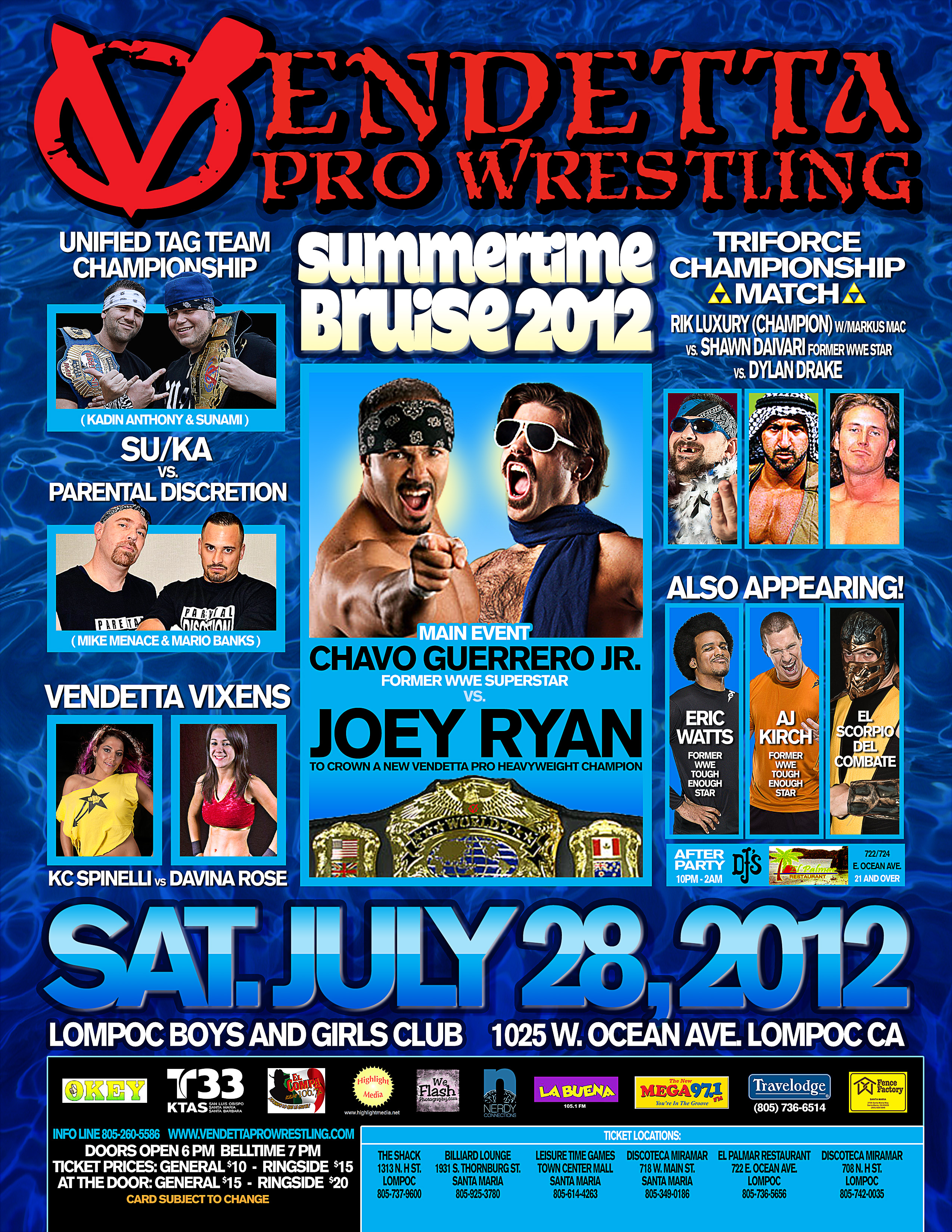 The Unified Boys & Girls Club of Lompoc will see a match for the Unified All Pro Wrestling & Vendetta Pro Wrestling Tag-Team Championships, as current reigning Champions and local favorites SU/KA (Sunami & Kadin Anthony) will defend against two members of Parental Discretion, Mike Menace and Mario Banks!